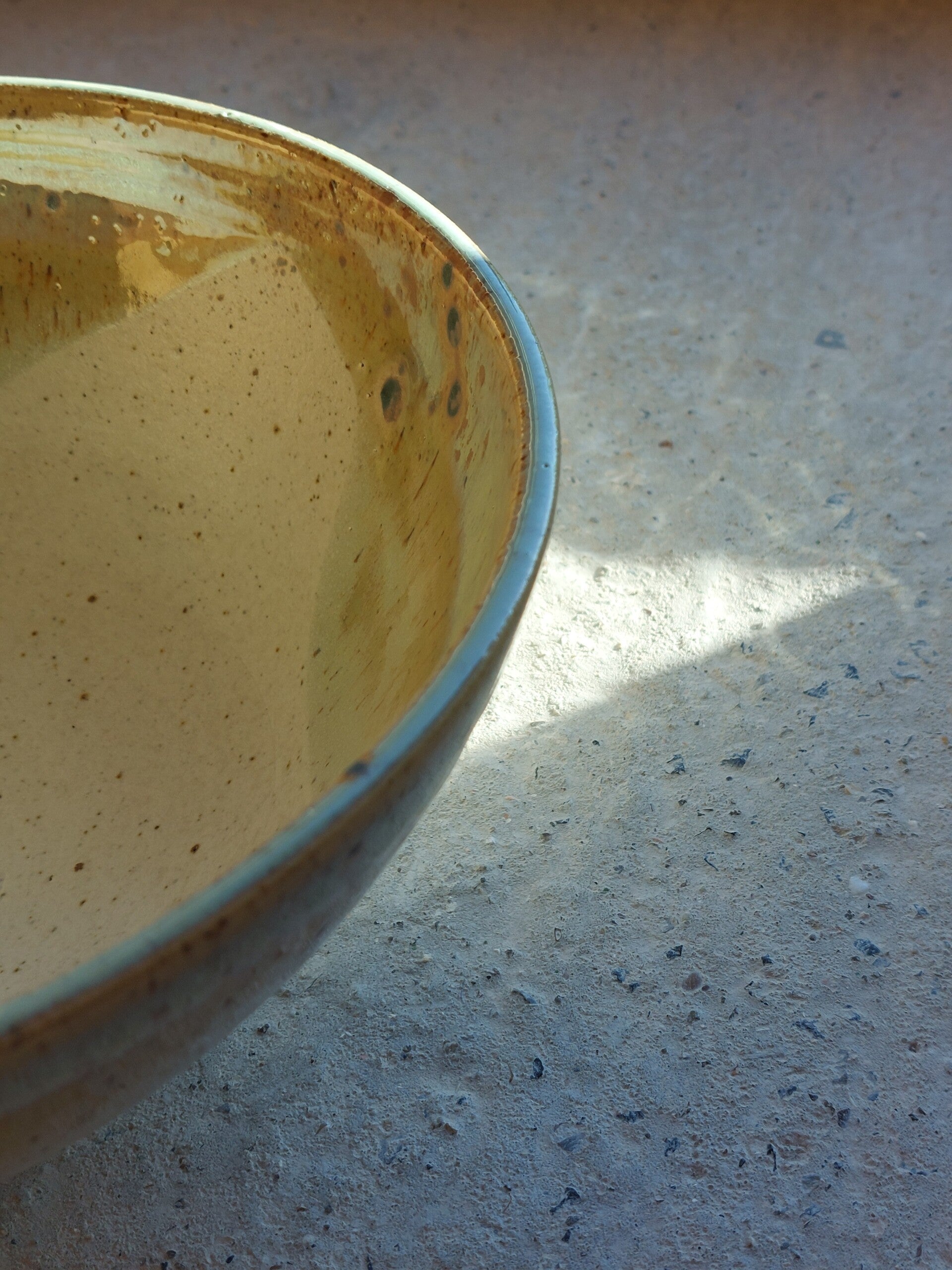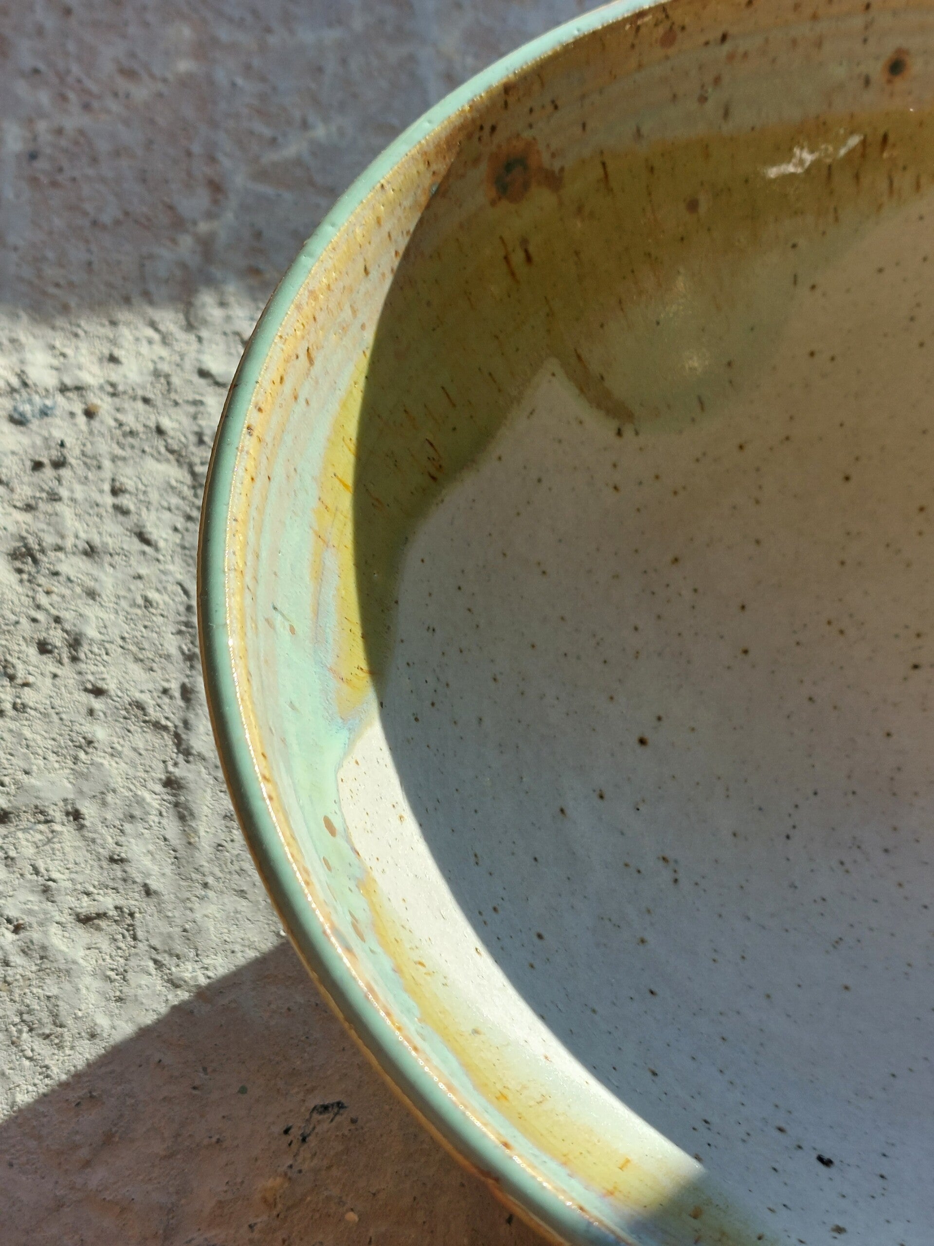 Na de biscuitbak wordt de schaal voorzien van zelfgemaakte glazuren, een matte en lichtgroene glazuur die elkaar overlappen waardoor je een mooi kleurenpalet krijgt.