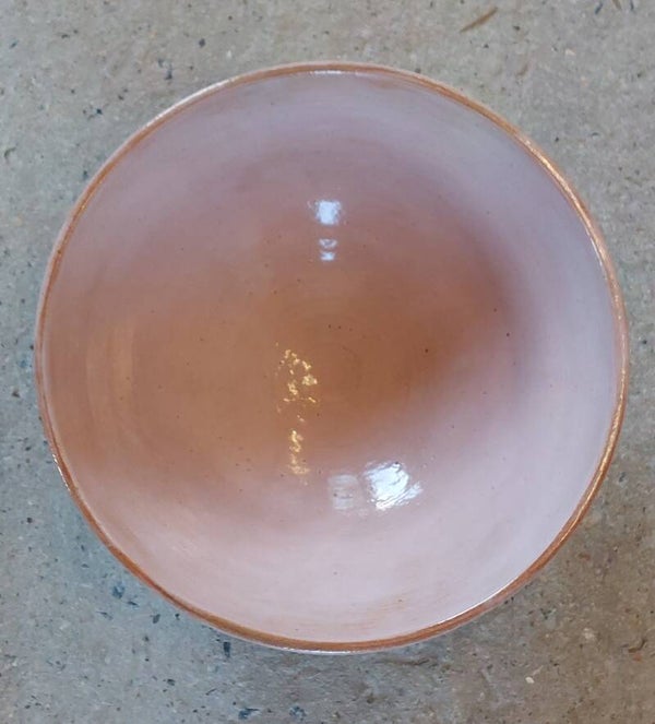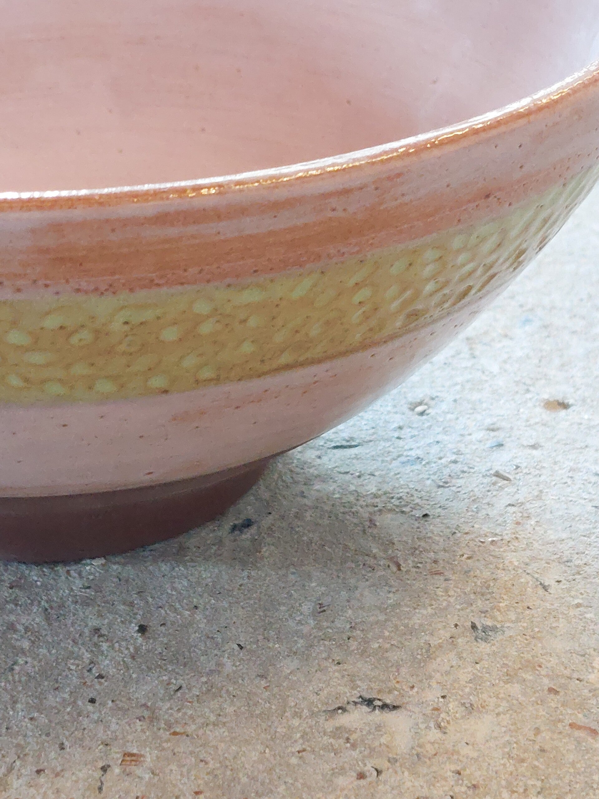 Na het maken van inkervingen aan de buitenkant, worden een gele en roze glazuur aangebracht. Alles wordt gebakken tot 1240 graden.