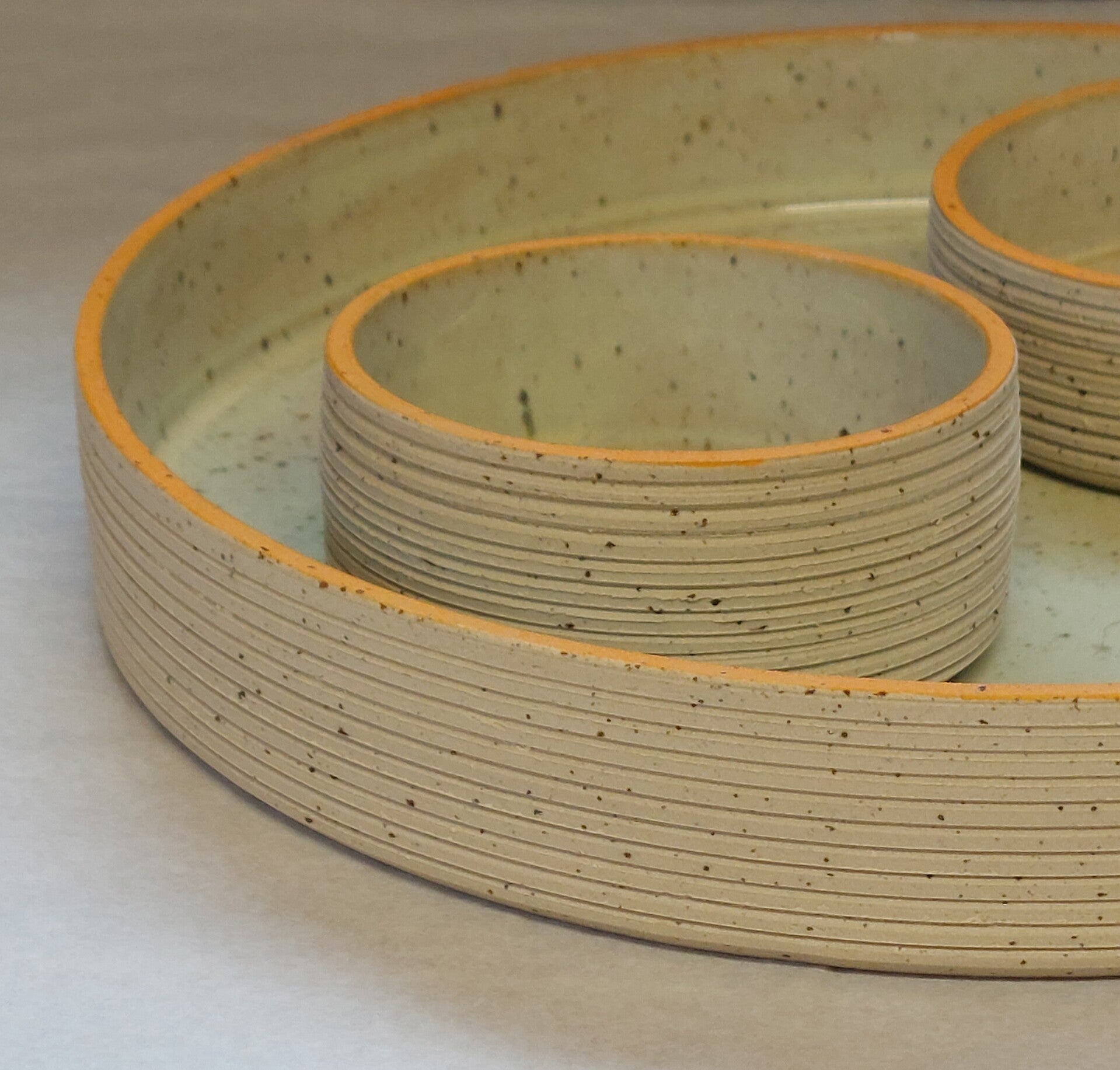 De grote schaal en twee kleine schalen zijn gemaakt van recupklei ,afgewerkt met een lichtgroene glazuur en een gele boord. Alles is gebakken tot 1240 graden