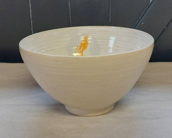 Na de biscuitbak wordt de schaal voorzien van zelfgemaakte glazuren, een matte glazuur aan de buitenkant en witte glazuur aan de binnenkant. Binnenin wordt een klein accent gegeven met een lichtblauwe en gele toets.