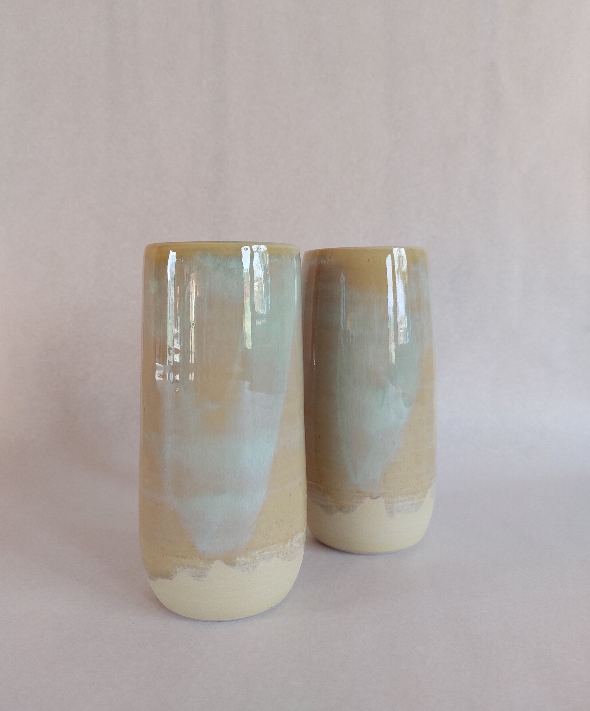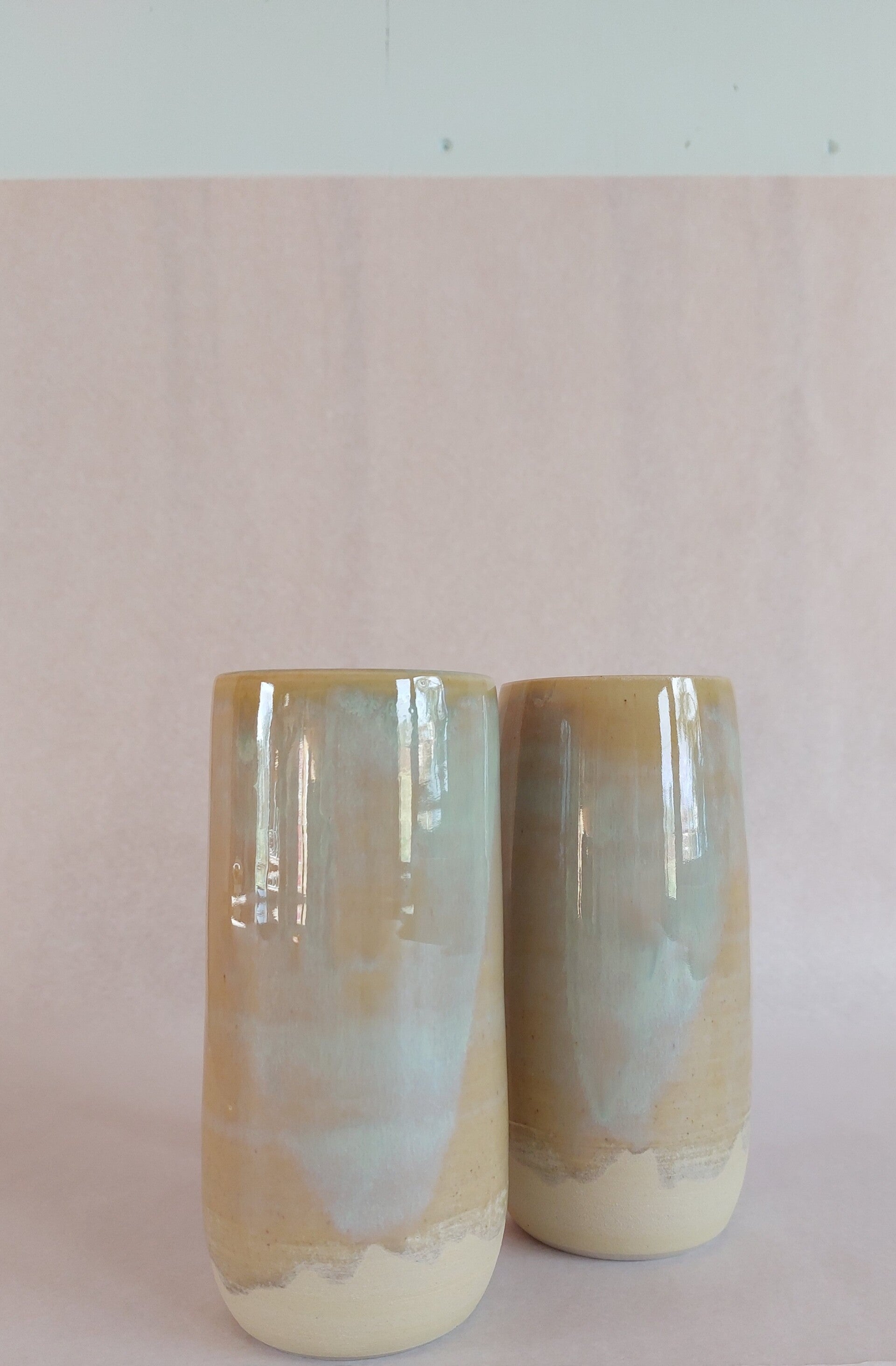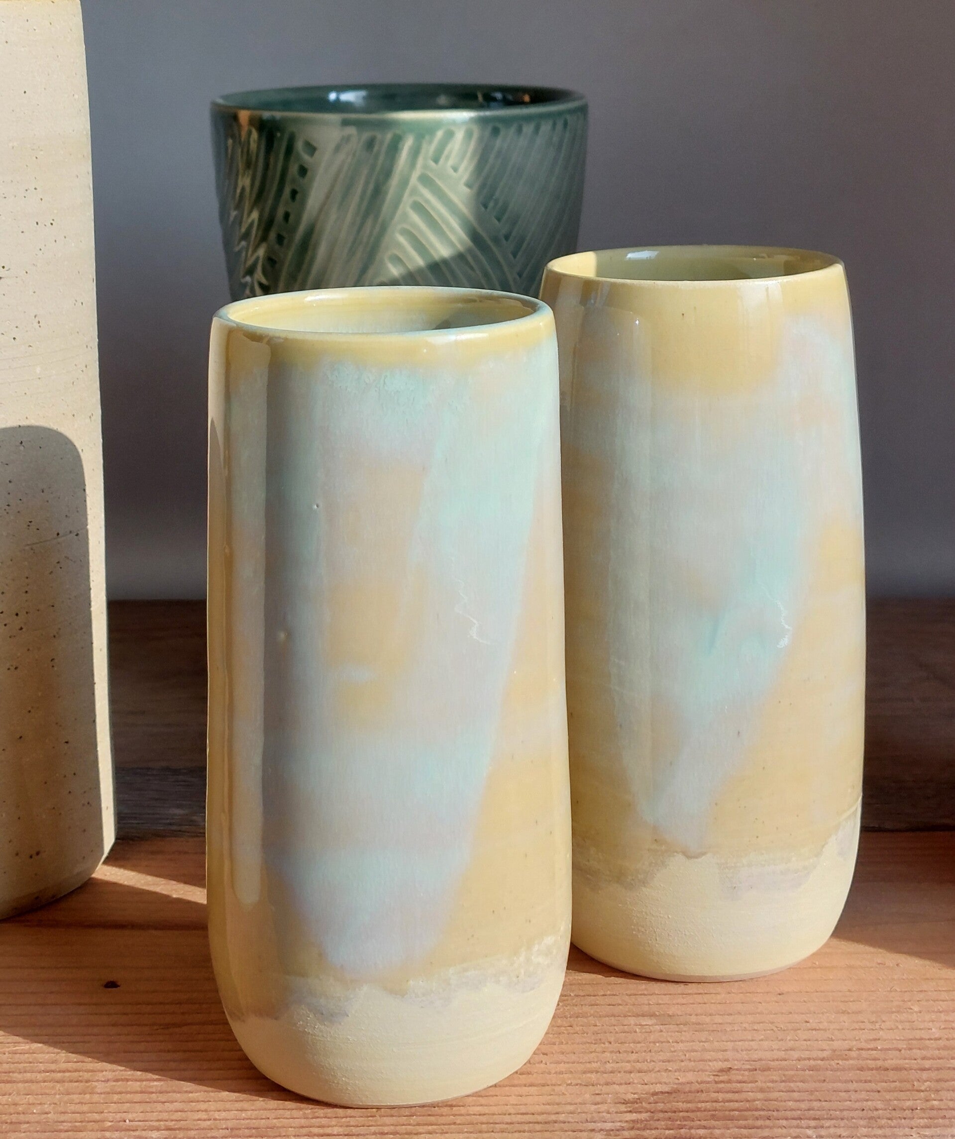 De vaas in gedraaid met witbakkende klei en afgewerkt met een groen, geel, bruine zelfgemaakte glazuur.