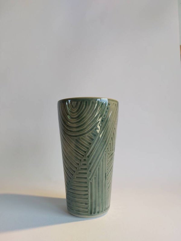 Een handgemaakte vaas met speelse inkervingen. De vaas in gedraaid met witbakkende klei en afgewerkt met een donkergroene glazuur.