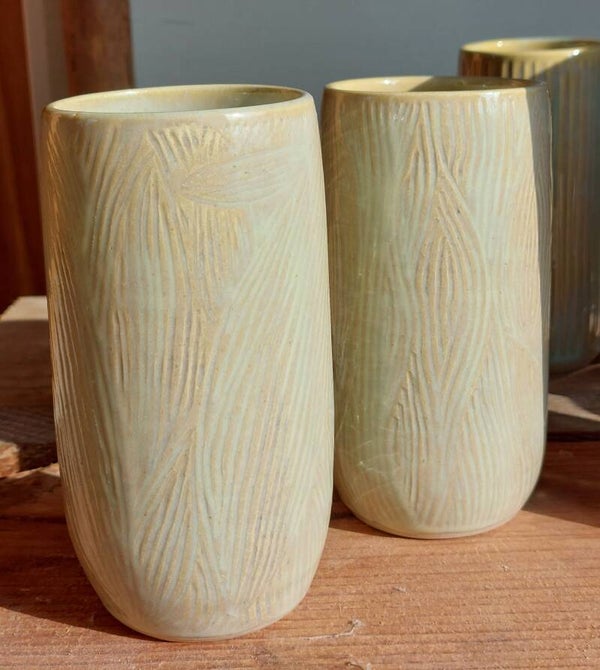 De vaas in gedraaid met witbakkende klei en afgewerkt met een lichtegroene glazuur. Eerst werd de vaas ingekerfd met een bladmotief.