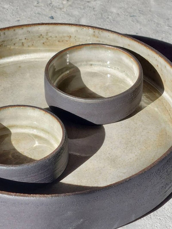 Aperitiefschaal in zwarte klei met groen, goud, beige glazuur