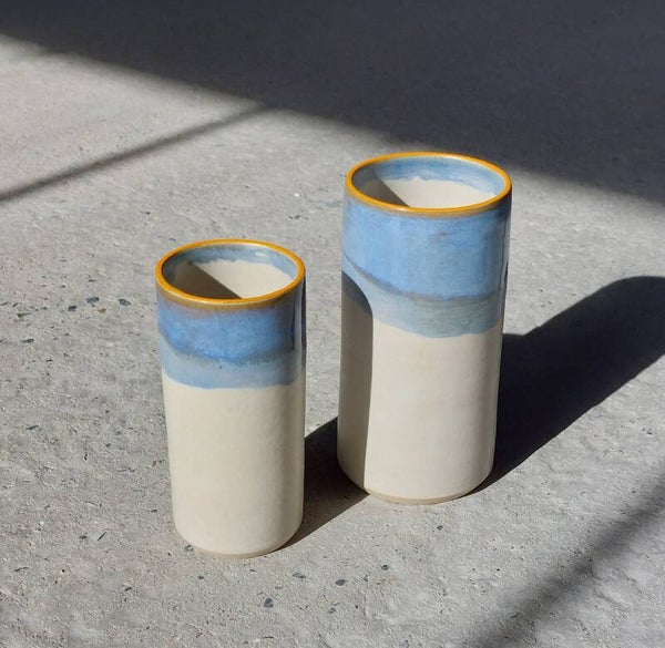 Vaas midden in witte klei met mat, blauw, gele glazuur