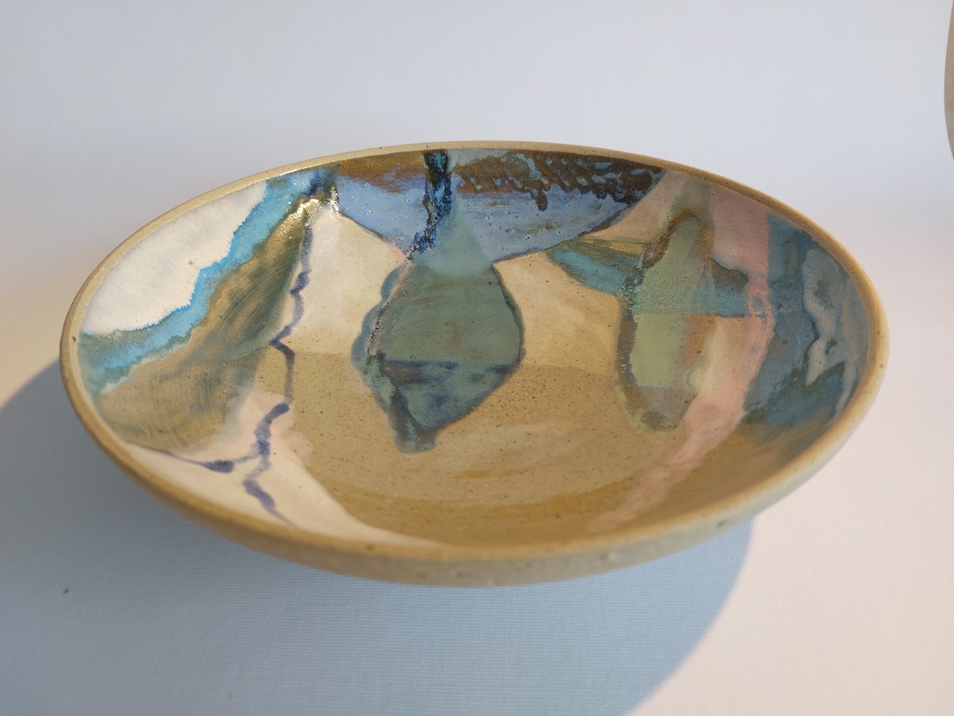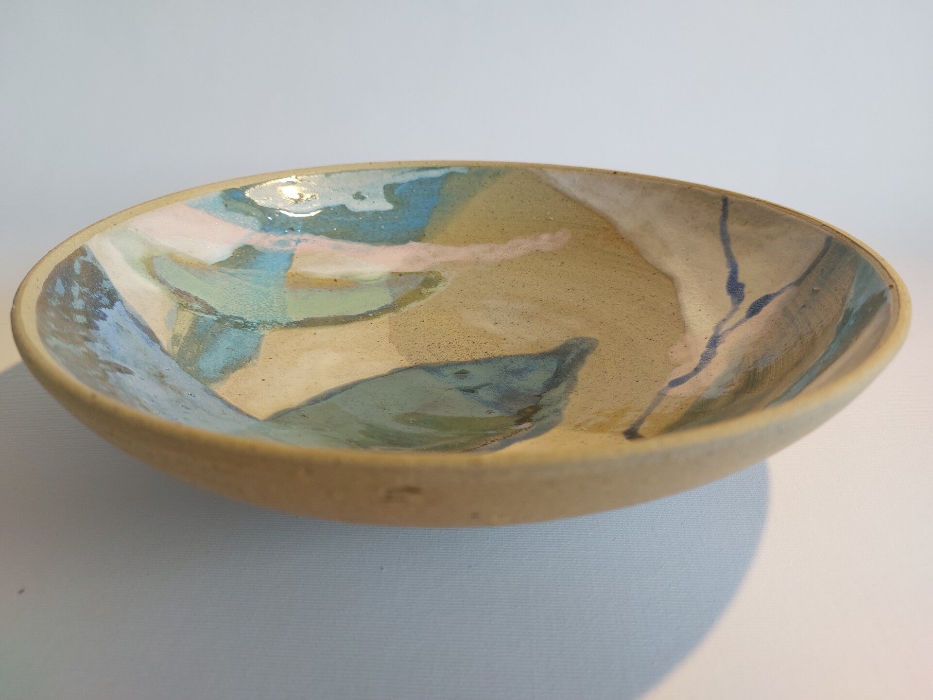 Door het werken met recupklei en verschillende glazuren, heeft de schaal een levendig karakter.