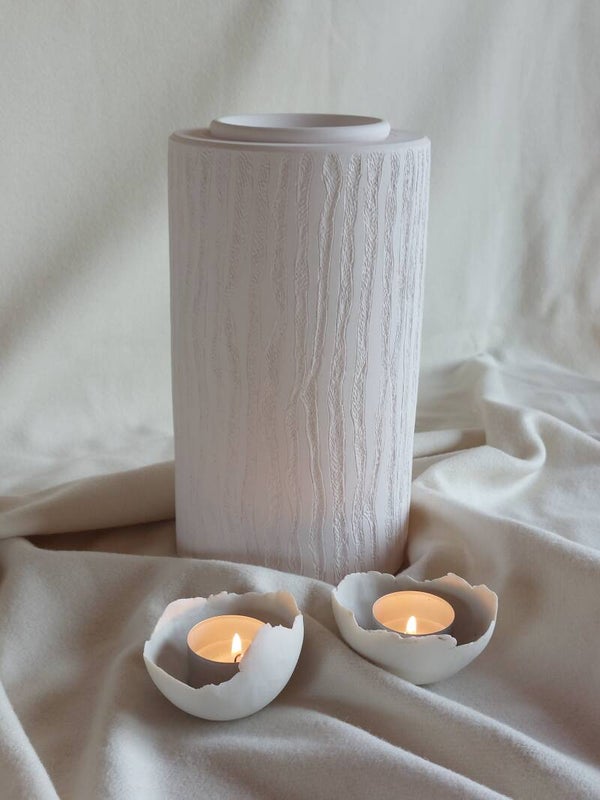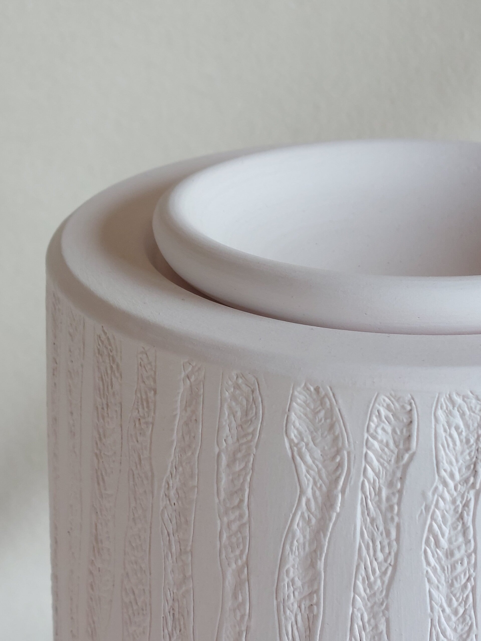 Deze urne is gedraaid in witte klei. In de wand worden zachte glooiende lijnen en subtiele inkervingen met de hand aangebracht.